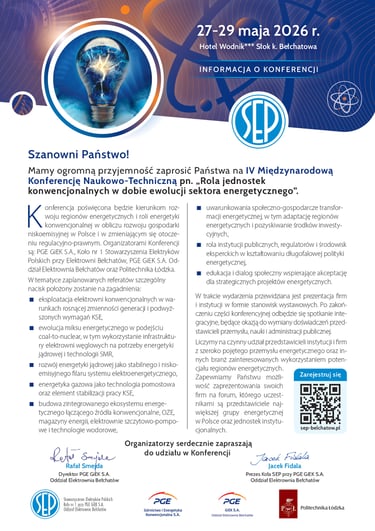 W imieniu Zarządu Koła nr 1 SEP przy PGE GiEK S.A. Oddział Elektrownia Bełchatów serdecznie dziękujemy za udział w III Konferencji Naukowo-Technicznej pn.: „ROLA JEDNOSTEK KONWENCJONALNYCH W DOBIE EWOLUCJI SEKTORA ENERGETYCZNEGO”, która odbyła się w dniach 28-30.05.2025 r. w Hotelu Wodnik*** Słok k/Bełchatowa.